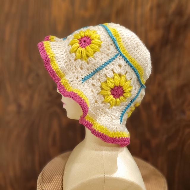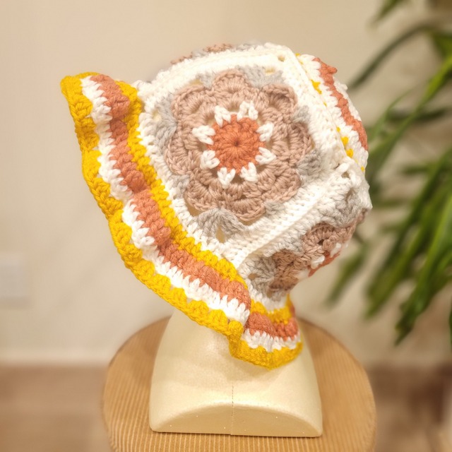 モチーフ編みのニット帽 | バケットハット 帽子 ブルー×イエロー