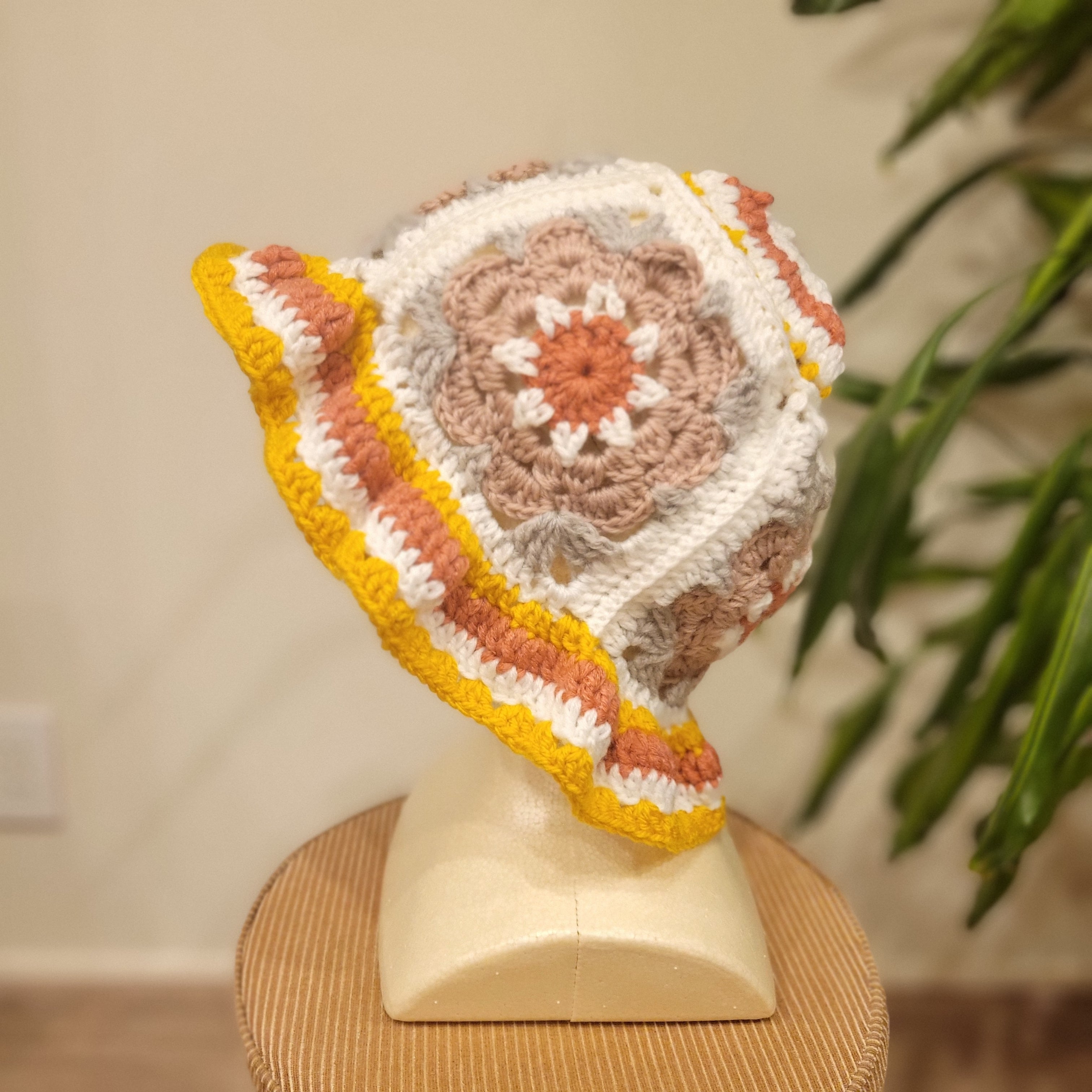 モチーフ編みのニット帽 | バケットハット 帽子 ホワイト×ピンク