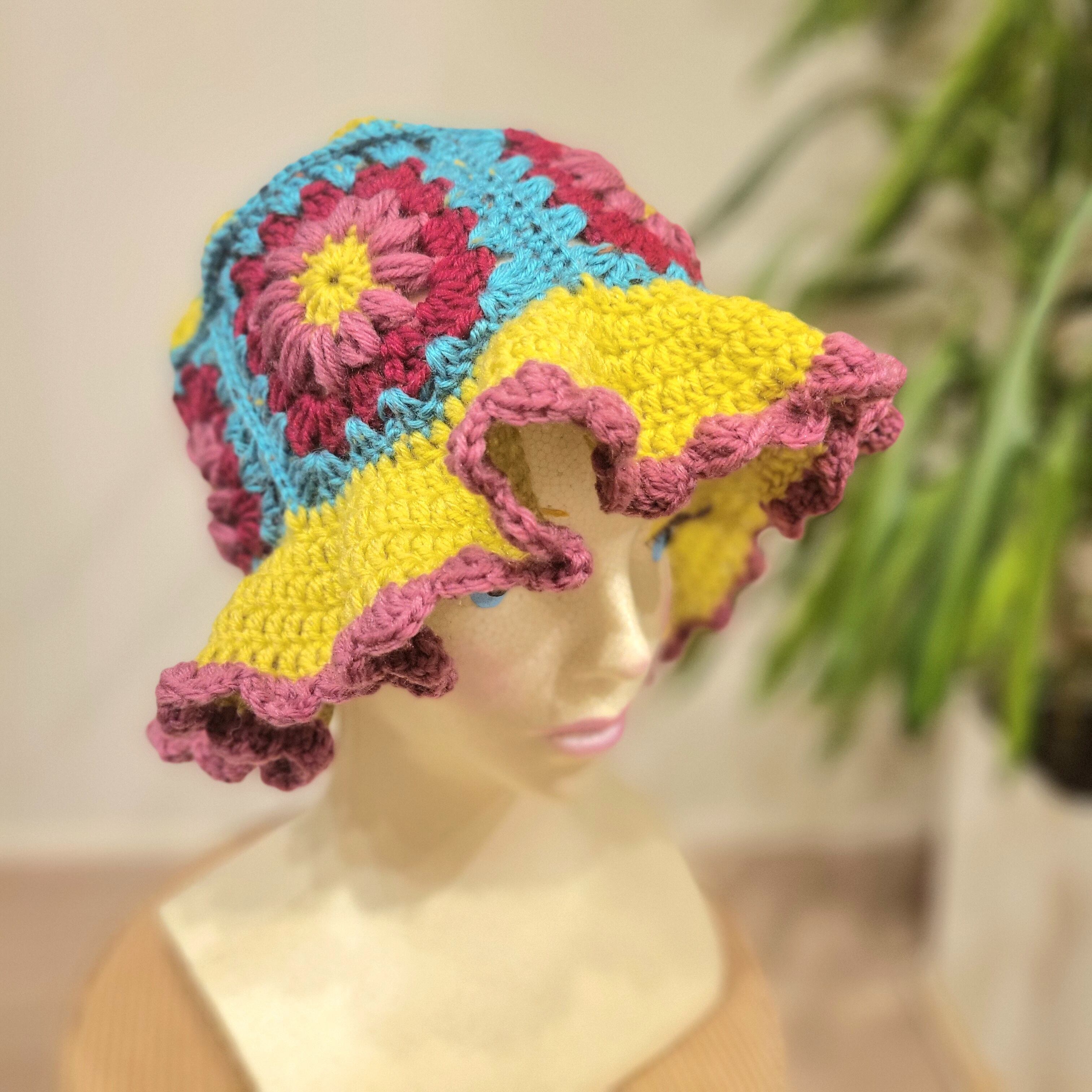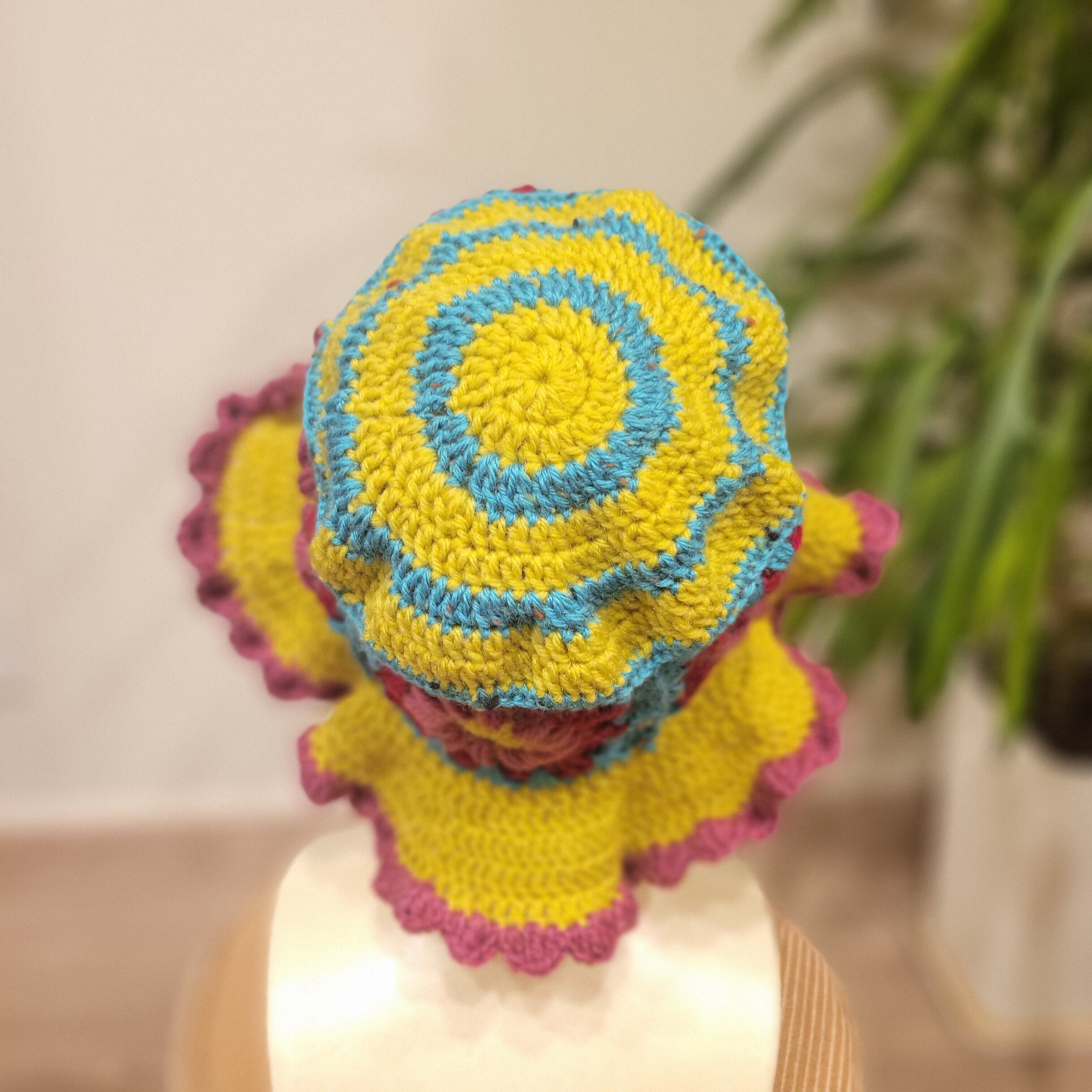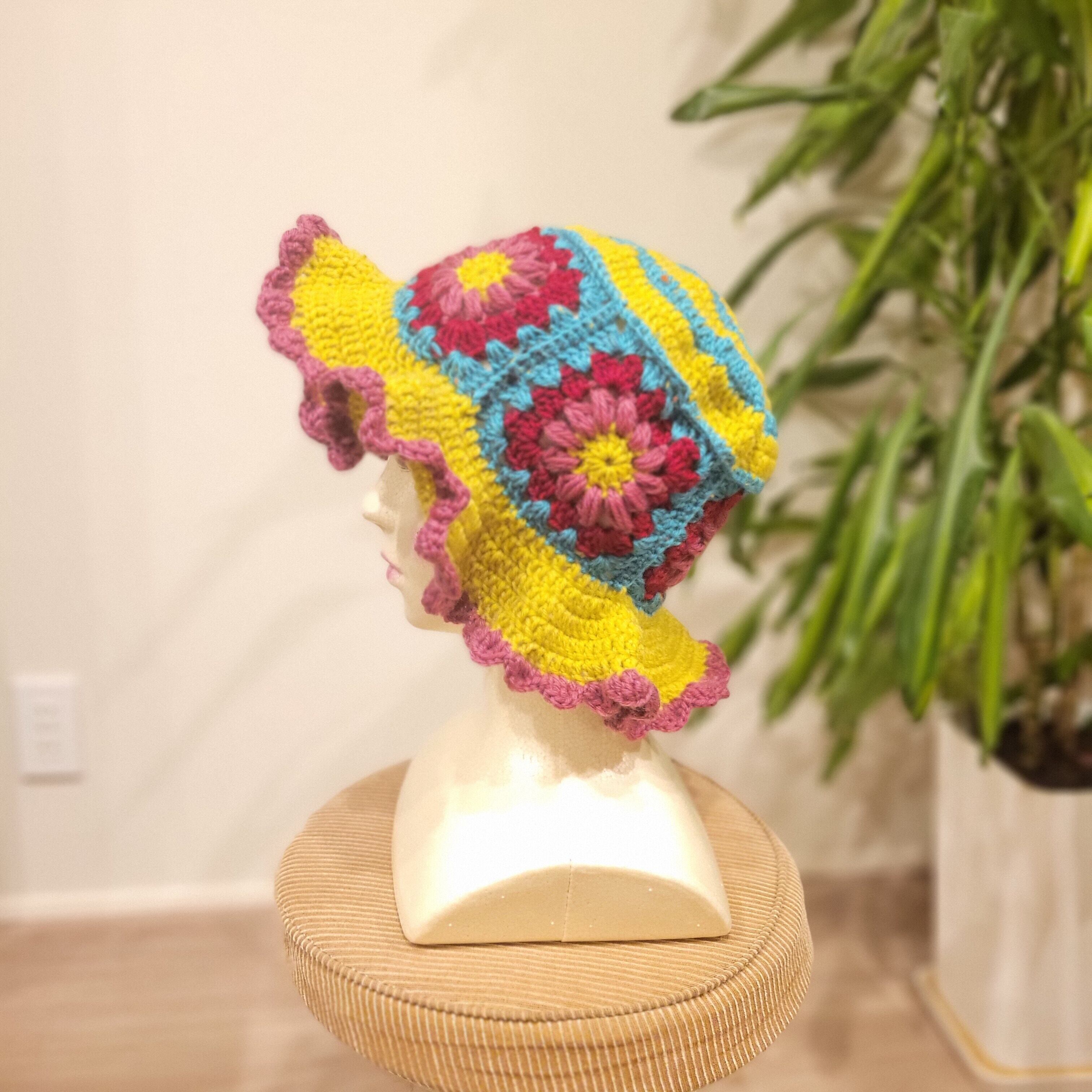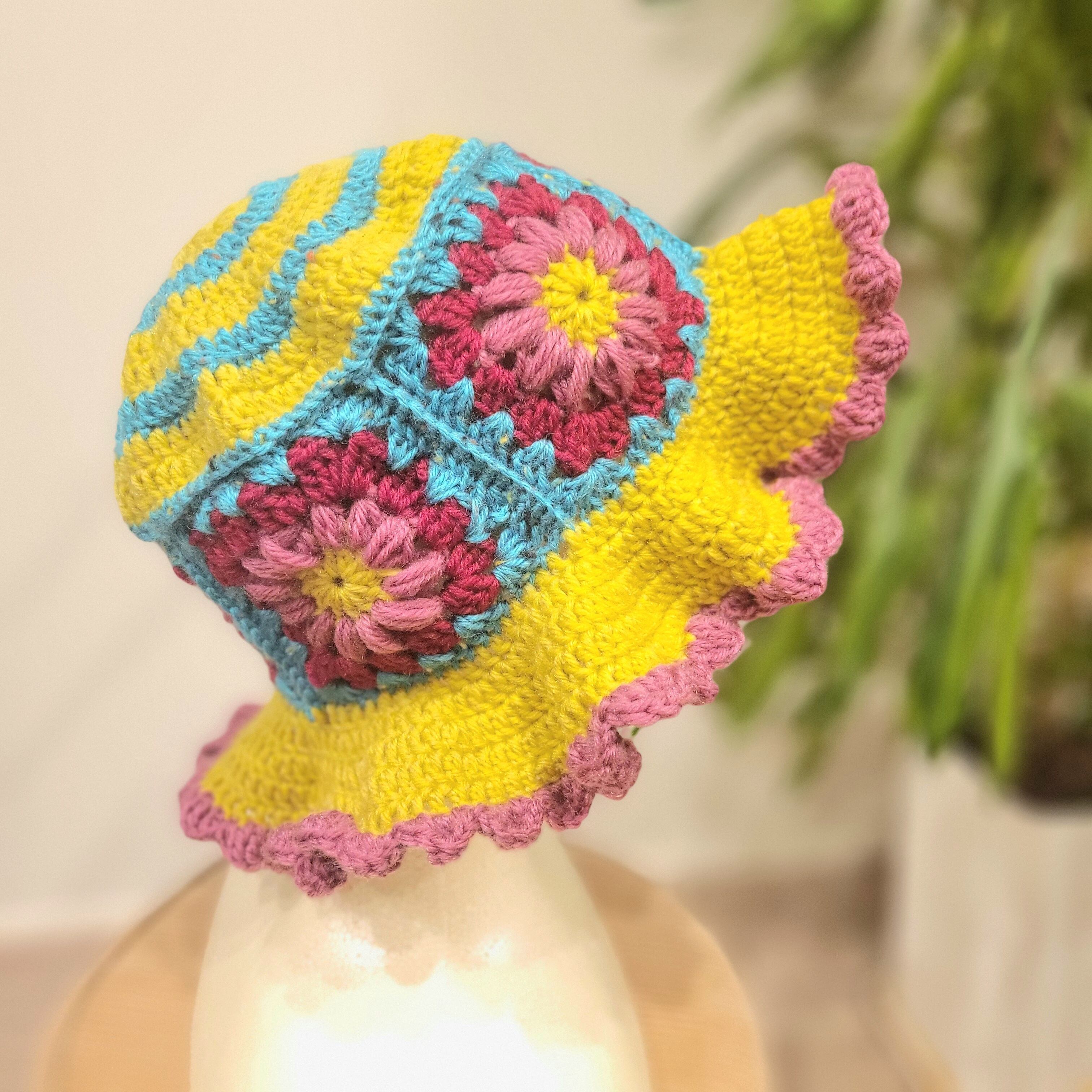 モチーフ編みのニット帽 | バケットハット 帽子 ライトグリーン×ブルー×イエロー